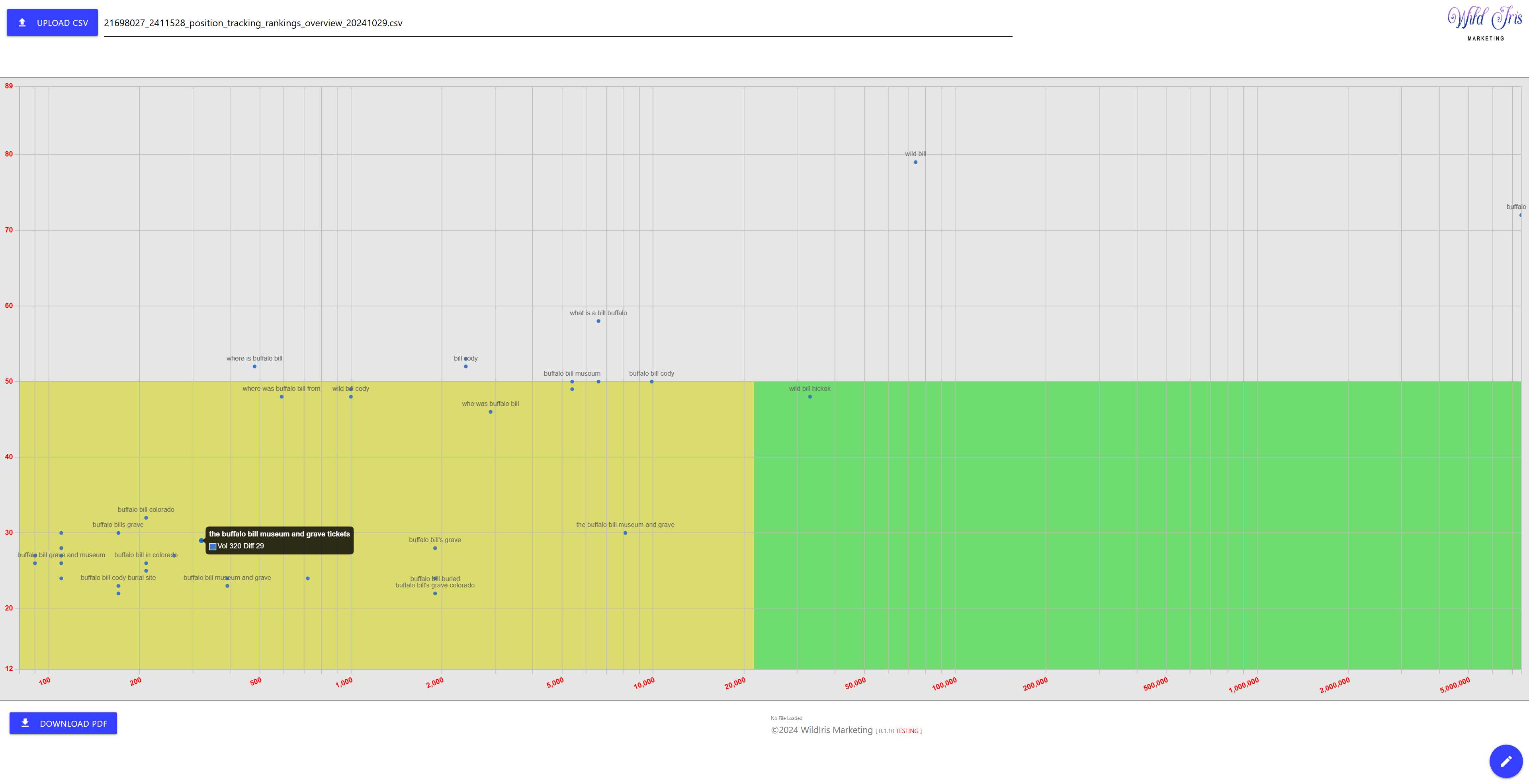 The tool doesn’t just stop at pretty graphs. It’s built for interaction. You can very rapidly filter out irrelevant or misspelled keywords, hone in on the sweet spots, and seamlessly switch between a table view and the dynamic plot. Need to share your findings with a client or team? Download a high-quality PDF of the scatterplot or export a refined list of your best keywords to a new CSV.